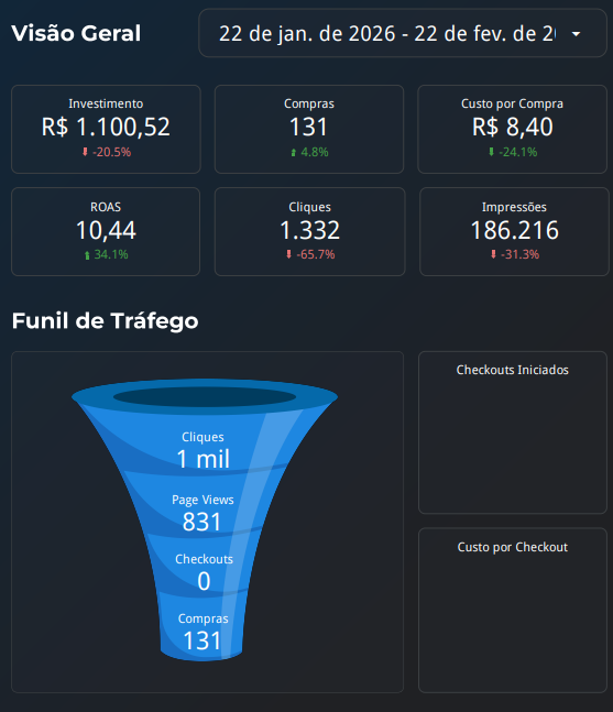 Foco em métricas reais (ROI, ROAS, LTV, CAC, Ticket Médio).